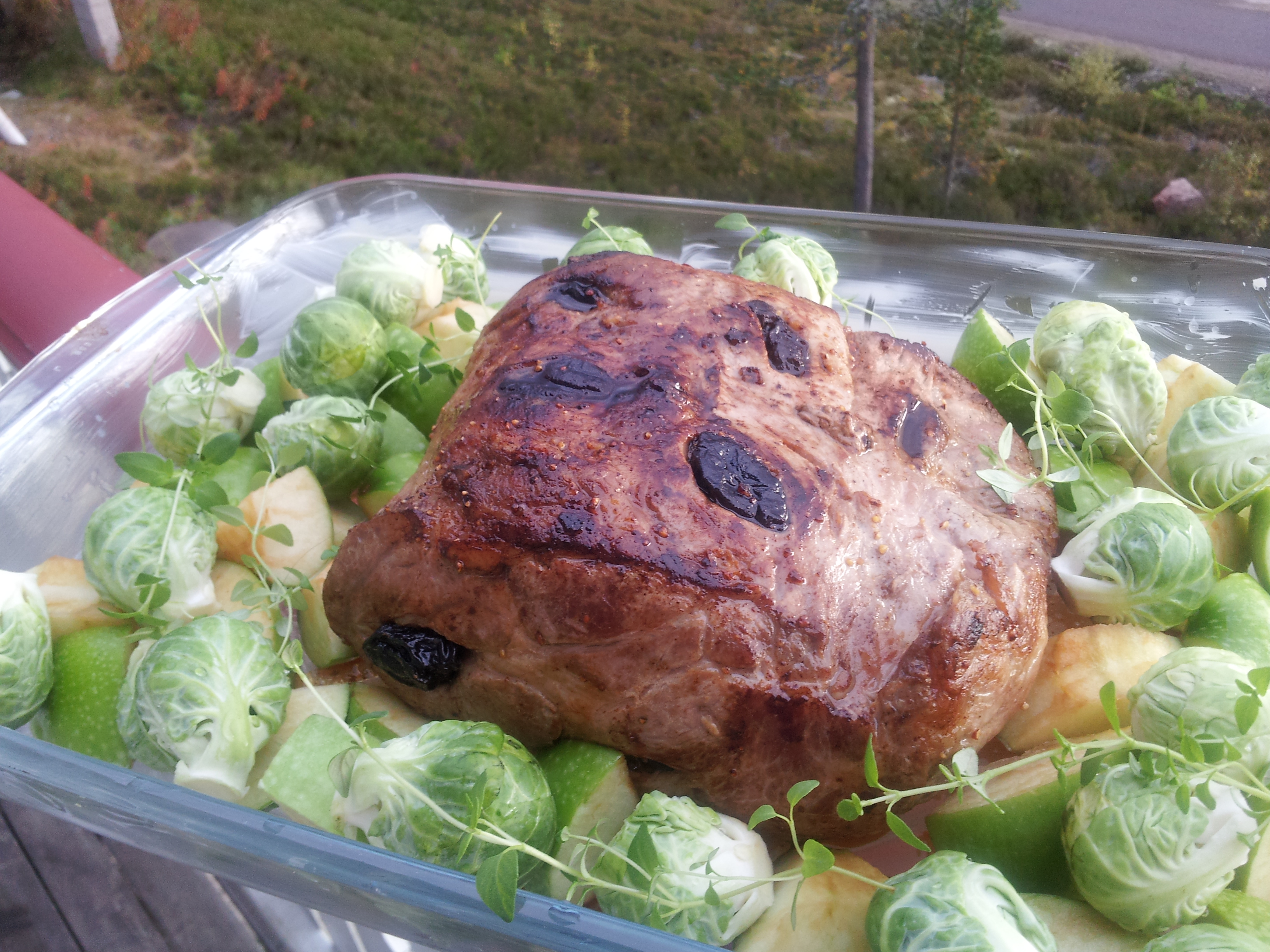 - Sätt ugnen på 175 grader. Gör hål runt om hela karrén för plommonen och stoppa in dem. Bind ihop köttet med steksnöre. (Detta brukar jag hoppa över.) Krydda köttet och bryn det hårt rumt om. Använd mycket smör. Lägg sedan karrén i en smord ugnsfast form.